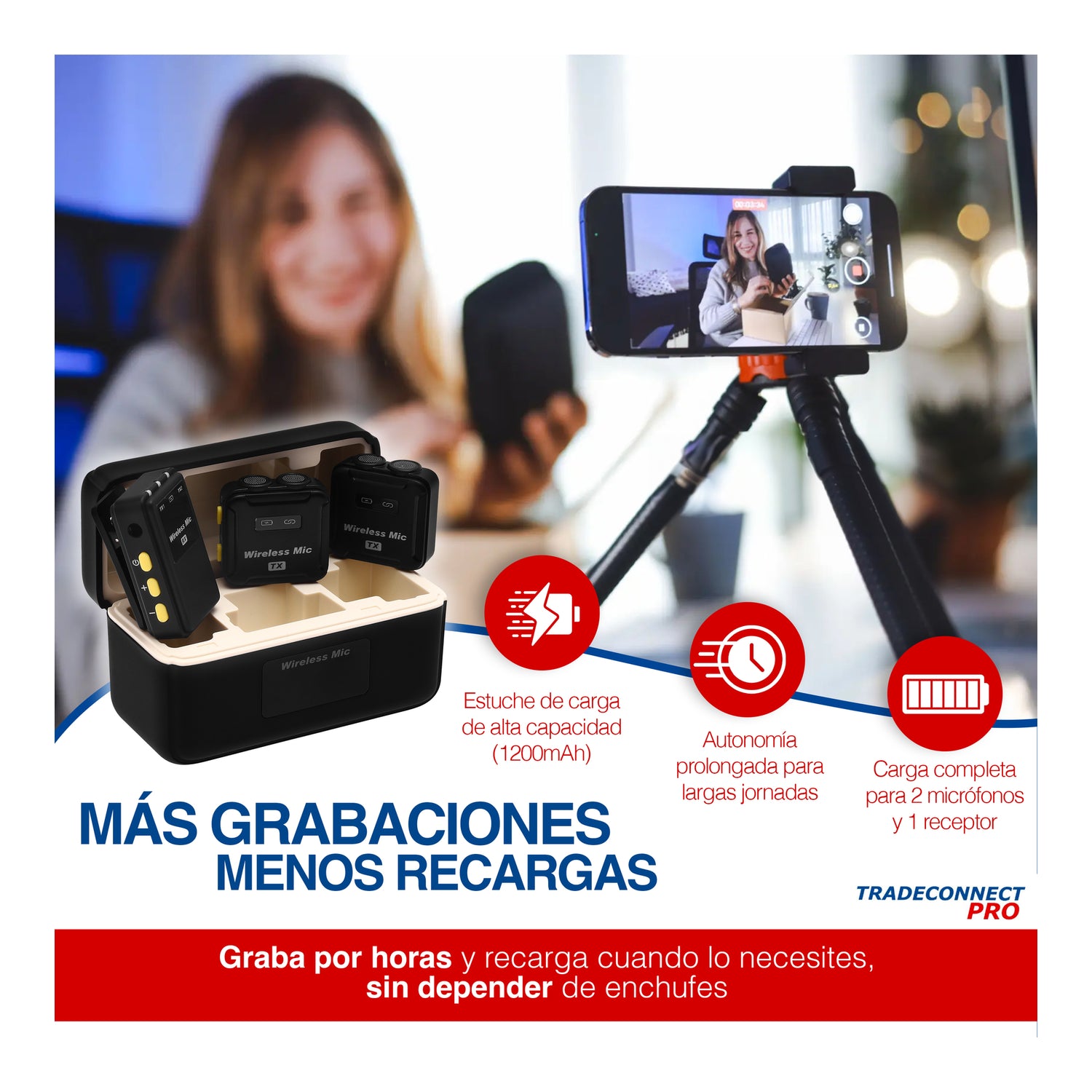 El estuche de carga de alta capacidad (1200 mAh) permite recargar 2 micrófonos y 1 receptor varias veces sin depender de enchufes.