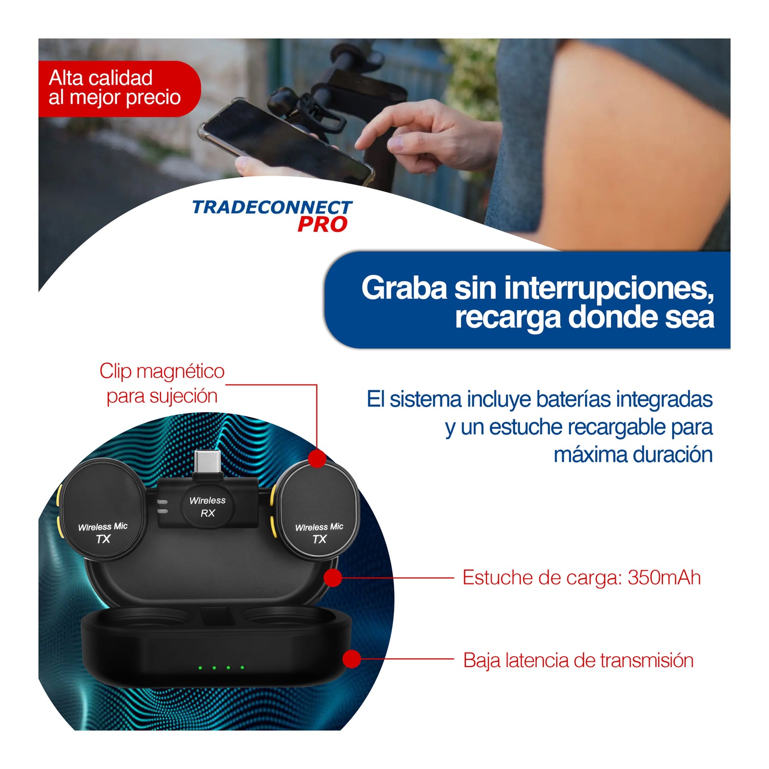 Micrófono inalámbrico LITE con clip magnético. Súper compacto y ligero, ideal para creadores en movimiento. Conexión 1 a 2, sonido profesional de baja latencia y batería duradera. Compatible solo con dispositivos USB-C (iPhone, iPad, Android y tablets modernas). Perfecto para entrevistas, vlogs y transmisiones en vivo.